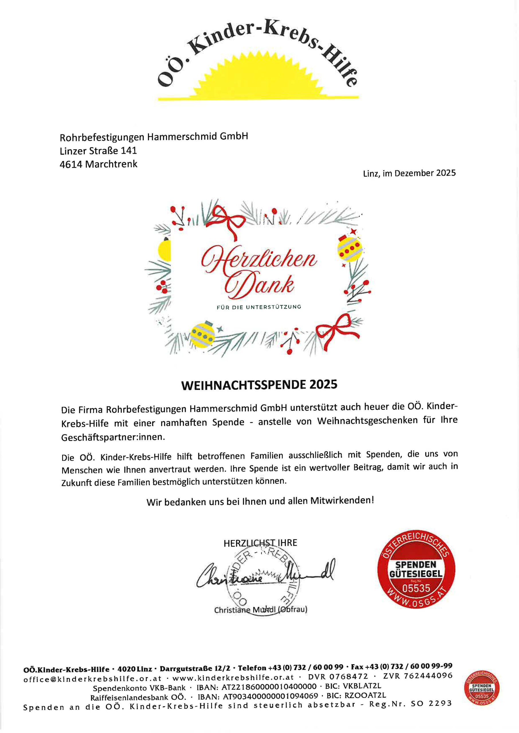 Wie auch in den letzten Jahren gibt es von uns eine finanzielle Unterstützung für die CliniClowns Oberösterreich, die OÖ. Kinder-Krebs-Hilfe sowie den Verein Rollende Engel und hoffen, mit dieser Zuwendung eine kleine Hilfe für leidtragende Kinder und deren Familien sowie für schwerkranke Personen geleistet zu haben.